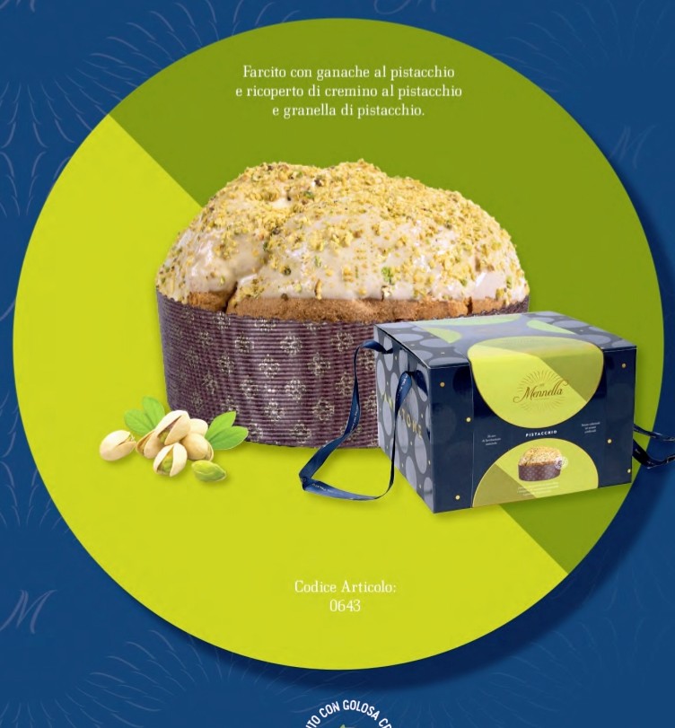 Farcito con ganache al pistacchio e ricoperto di cremino al pistacchio e granella di pistacchio.