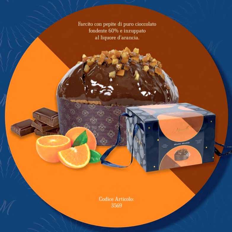 Farcito con pepite di puro cioccolato fondente 60% e inzuppato al liquore d'arancia.
