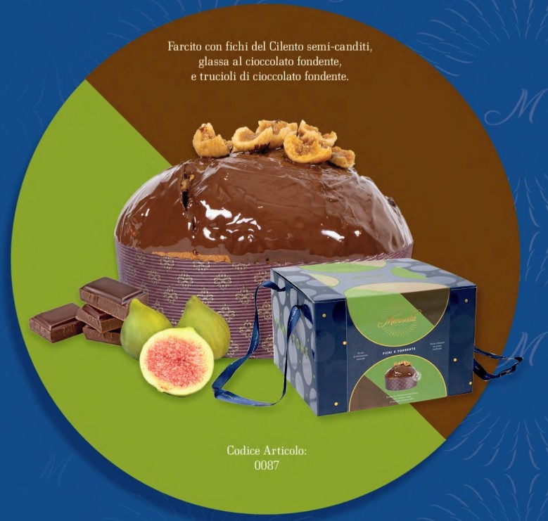 Farcito con fichi del Cilento semi-canditi, glassa al cioccolato fondente, e trucioli di cioccolato fondente.