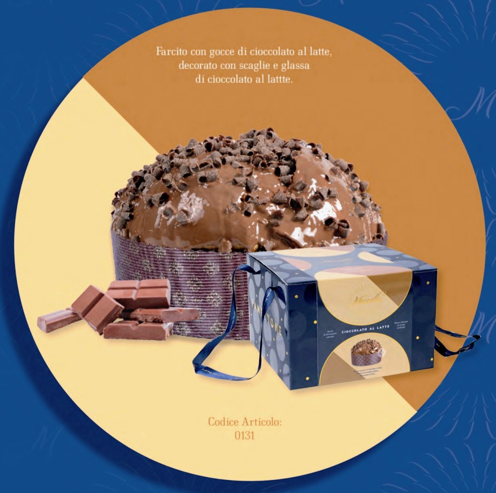 Farcito con gocce di cioccolato al latte, decorato con scaglie e glassa di cioccolato al latte.